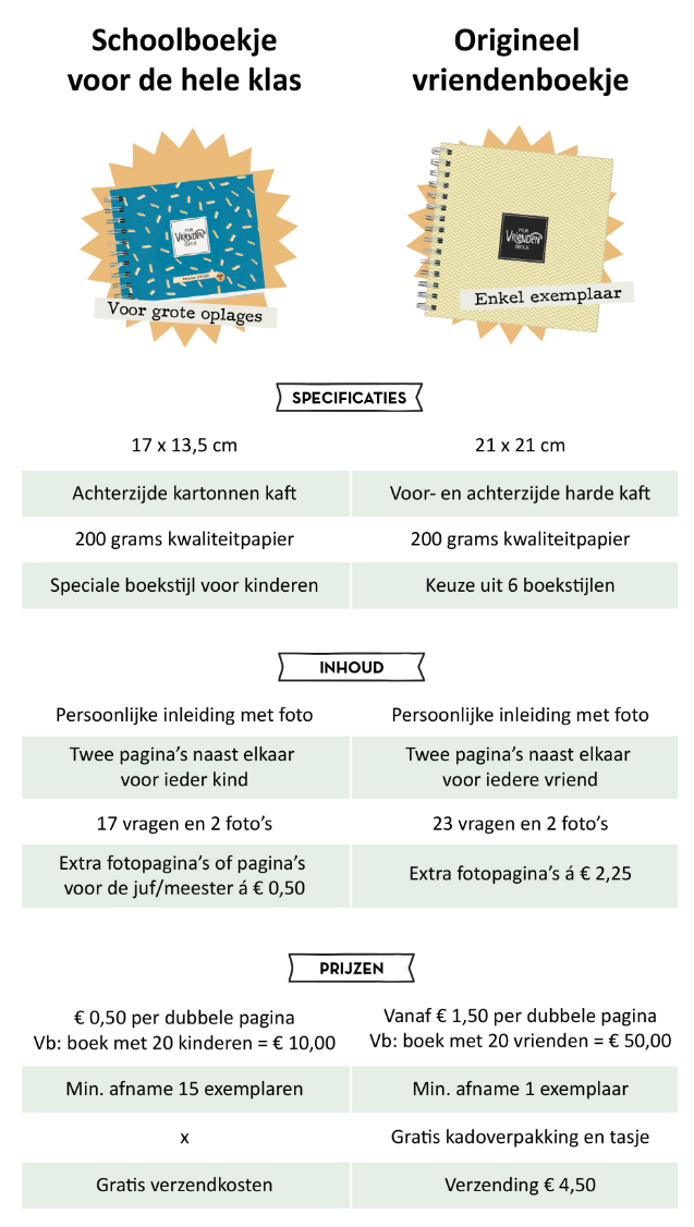 Maak eenvoudig met de hele klas een vriendenboekje om de mooie tijd op de basisschool vast te leggen. Iedereen vult zelf, online de vragenlijst in en upload twee foto's. Het resultaat; een geslaagd cadeau voor alle kinderen én de juf of meester.